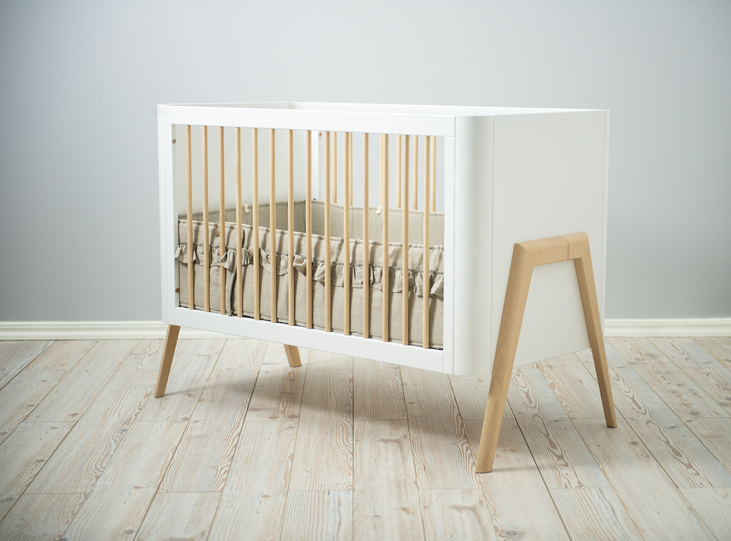 Our gorgeous TORSTEN Cot in duo colours, white and natural wax for the dowels and support legs. (Non-Toxic and non-formaldehyde Paint)